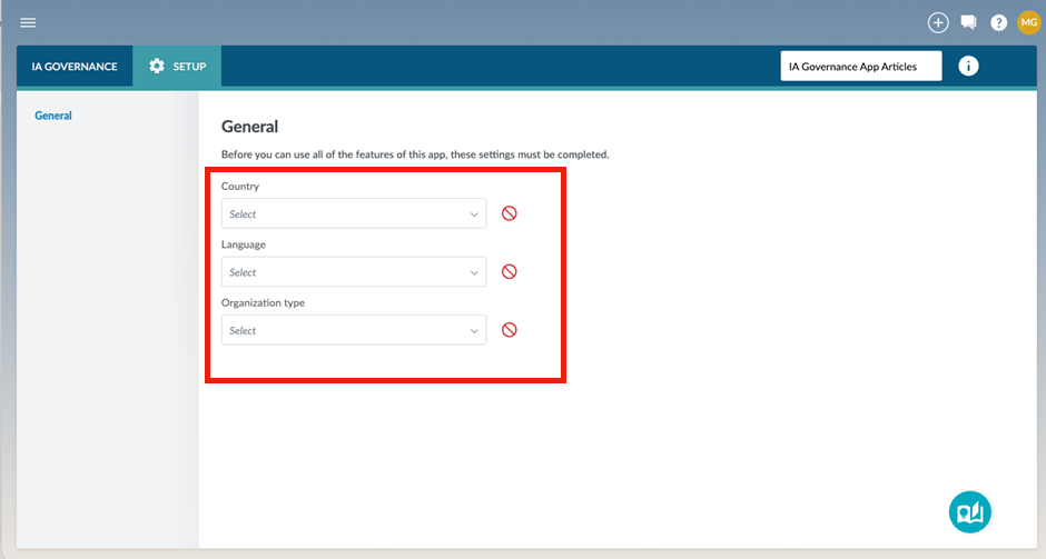 The General page under the SETUP module allows you to define the basic information that shapes how your IA Governance application is generated. The selections you make here determine the default content, language, and regional context that appear throughout the rest of the application.
