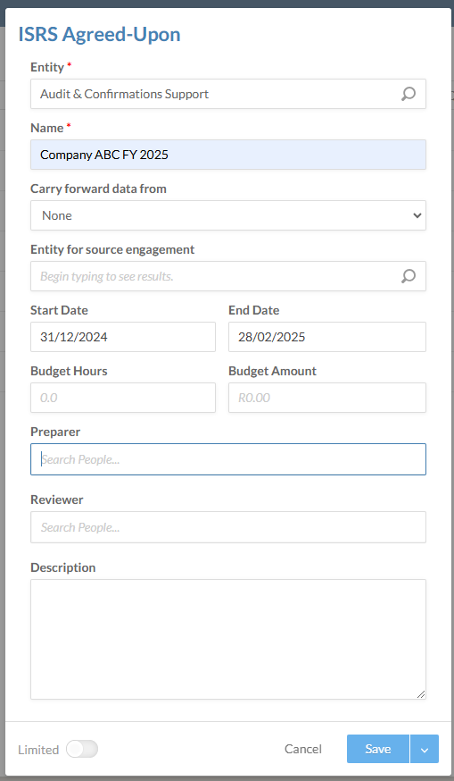 - In the New Engagement dialog, select the ISRS Agreed-Upon option.