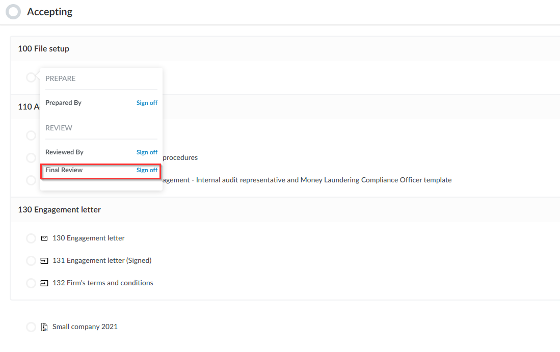 - Second Reviewer - Select to add a second reviewer for all sign-offs. This adds a Final Review to all sign-off options.