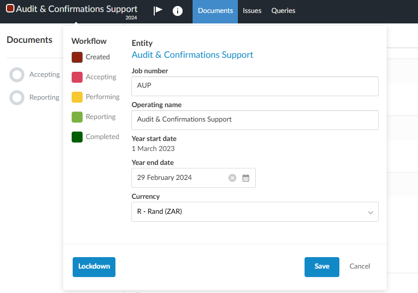 - Lockdown - select to lock the engagement file, once all the work is complete. To learn more, see Lockdown the Engagement.