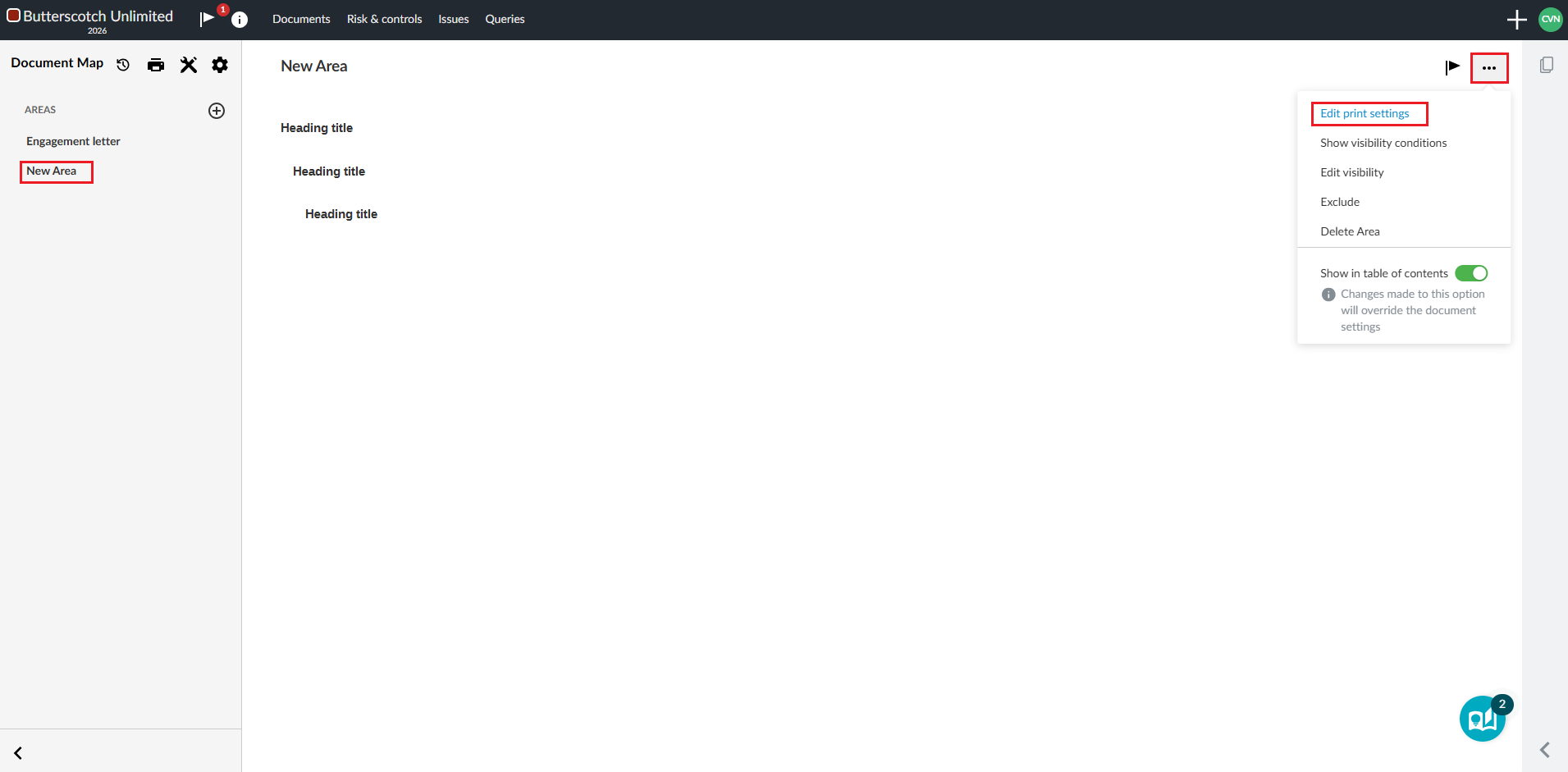 - You can now hide individual headings for areas from the table of contents as well as hide the numbering for an individual heading from the More actions (