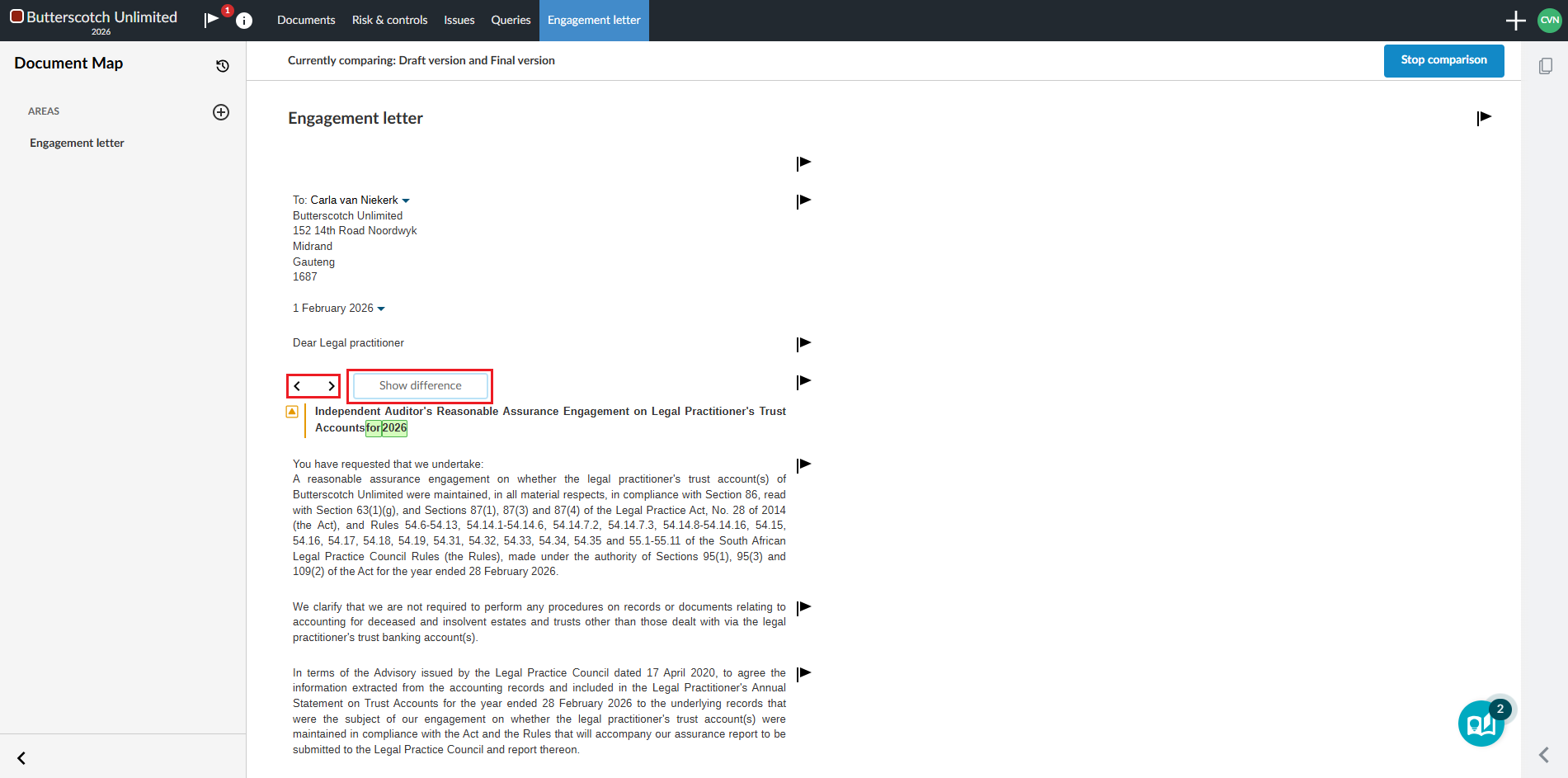 | Engagement letter | 116.1 | The engagement letter has been adjusted to include the engaging party/ responsible party, intended users, purpose of the engagement, ethical standards, independent requirements and formulated procedures. |