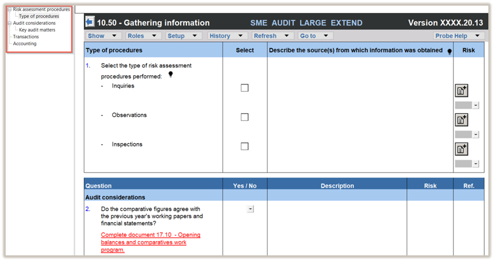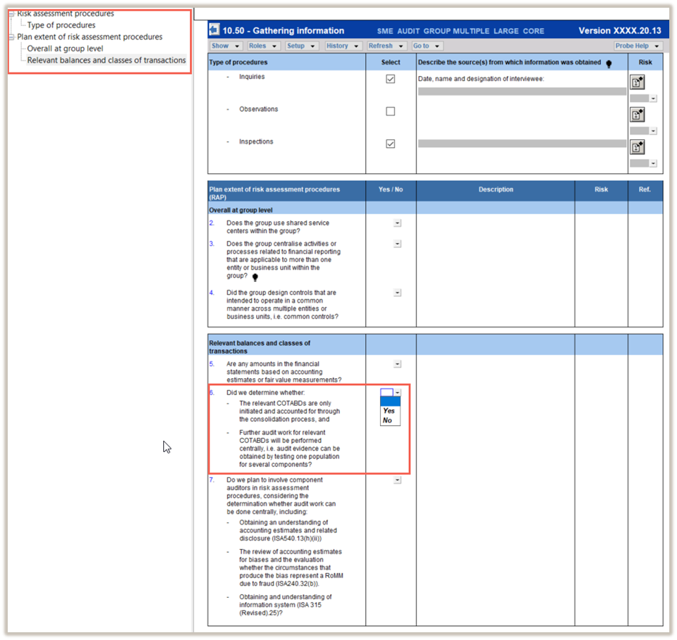 When the engagement type was selected as ‘Group Audit Single’ or ‘Group Audit Multiple’, only sub-sections “Risk assessment procedures” and “Plan extent of risk assessment procedures” will be included until you answered “Yes” to the question “Did we determine whether: