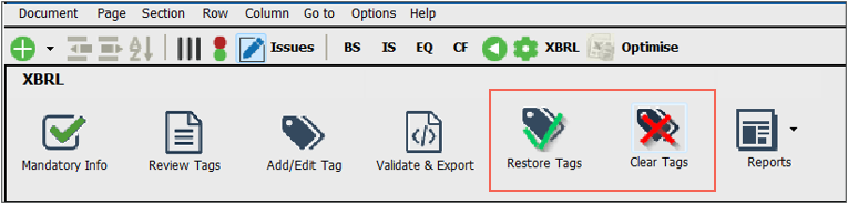 It is best practice to clear and restore tags before doing Validate & Export for the first time, this will ensure that all the correct tags have been applied throughout the financials.